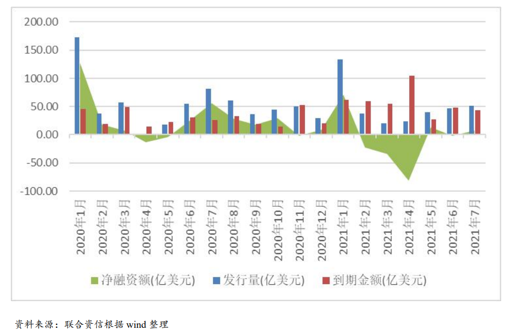 美元債融資方面,發(fā)行量同比大幅減少,凈融資規(guī)模為負(fù)。2021年1-7月,境內(nèi)房地產(chǎn)企業(yè)美元債發(fā)行總量353.08億美元,同比減少16.69%,受境內(nèi)房企違約事件頻發(fā)影響,加之恒大風(fēng)險(xiǎn)持續(xù)發(fā)酵,投資者風(fēng)險(xiǎn)偏好降低,自2月以來(lái),地產(chǎn)美元債發(fā)行量保持低位;凈融資規(guī)模方面,2021年1-7月,境內(nèi)房地產(chǎn)企業(yè)美元債到期401.13億美元,凈融資轉(zhuǎn)為凈流出;分月份看,為應(yīng)對(duì)年內(nèi)到期的美元債兌付,1月境內(nèi)房地產(chǎn)企業(yè)美元債凈融資規(guī)模較大,2-4月凈融資規(guī)模持續(xù)凈流出且規(guī)模較大,5月以來(lái)凈融資規(guī)模保持低位。