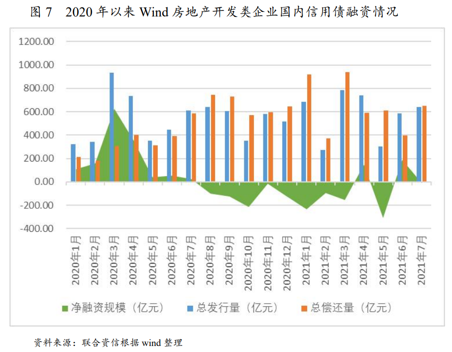 在房地產(chǎn)融資監(jiān)管持續(xù)高壓及地產(chǎn)違約事件頻發(fā)下,投資者風(fēng)險(xiǎn)偏好下行,發(fā)行規(guī)模增速明顯放緩,凈融資規(guī)模走弱。具體來(lái)看,2021年1-7月房地產(chǎn)開(kāi)發(fā)類(lèi)企業(yè)信用債發(fā)行總量4005.56億元,同比增長(zhǎng)7.63%,增速明顯放緩;考慮到償還規(guī)模4492.93億元,實(shí)際融資規(guī)模偏低;分月份看,3月和4月是集中融資月份,占上半年融資總額的45.27%,與往年走勢(shì)基本一致;受“三條紅線”影響,2021年1-7月,房企國(guó)內(nèi)債券凈融資規(guī)模為負(fù)。