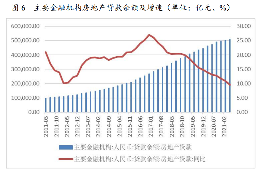 從房地產(chǎn)企業(yè)主要融資渠道銀行信貸來(lái)看,銀行信貸流向房地產(chǎn)領(lǐng)域的增速持續(xù)下降。截至2021年二季度末,國(guó)內(nèi)主要金融機(jī)構(gòu)房地產(chǎn)貸款余額為507800億元,同比增長(zhǎng)9.5%,為2011年以來(lái)首次低于兩位數(shù),增速創(chuàng)歷史新低。同時(shí)考慮到“房住不炒”的整體政策基調(diào)以及金融機(jī)構(gòu)房地產(chǎn)貸款集中管理制度的影響,主要金融機(jī)構(gòu)仍將壓降房地產(chǎn)貸款增速。