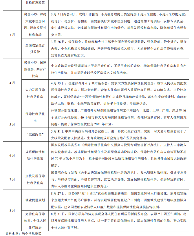與此同時(shí),在嚴(yán)格執(zhí)行“房住不炒、因城施策”的政策大環(huán)境下,新型城鎮(zhèn)化、住房保障體系建設(shè)作為重點(diǎn)持續(xù)被強(qiáng)調(diào)。3月5日,李克強(qiáng)總理作政府工作報(bào)告,提出通過(guò)增加土地供應(yīng)、安排專(zhuān)項(xiàng)資金、集中建設(shè)等辦法,切實(shí)增加保障性租賃住房和共有產(chǎn)權(quán)住房供給。此后,住建部4月召開(kāi)6個(gè)城市座談會(huì),要求各地增加土地、財(cái)稅、金融等政策支持,切實(shí)增加保障性租賃住房供給;7月,國(guó)務(wù)院發(fā)布《加快發(fā)展保障性租賃住房的意見(jiàn)》,要求從土地、審批流程、資金、稅費(fèi)等多方面支持保障性租賃住房建設(shè)。8月31日,國(guó)新辦舉辦的努力實(shí)現(xiàn)全體人民住有所居的新聞發(fā)布會(huì),表示“十四五”期間,將以發(fā)展保障性租賃住房為重點(diǎn),進(jìn)一步完善住房保障體系,增加保障性住房的供給,努力實(shí)現(xiàn)全體人民住有所居。