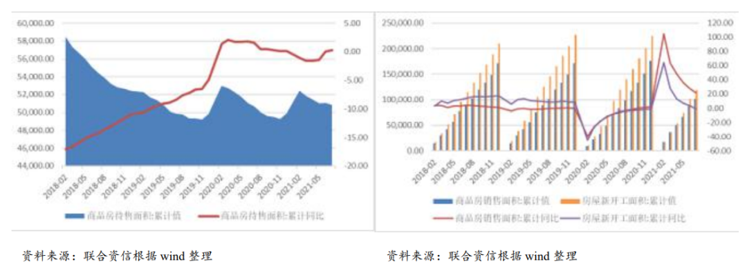 從狹義庫(kù)存(已竣工商品房待售面積)指標(biāo)來(lái)看,截至2021年7月底,商品房待售面積50864.00萬(wàn)平方米,同比增長(zhǎng)0.30%;整體看,已竣工商品房庫(kù)存年初達(dá)到高位,2-5月環(huán)比下行,6月以來(lái)庫(kù)存有所反彈。廣義庫(kù)存(累計(jì)新開(kāi)工面積-累計(jì)銷(xiāo)售面積)方面,2021年1-7月,全國(guó)商品房新開(kāi)工面積118948.27萬(wàn)平方米,同比下降0.90%,累計(jì)銷(xiāo)售面積101648.18萬(wàn)平方米,同比增長(zhǎng)21.50%,廣義庫(kù)存有所增長(zhǎng)。
