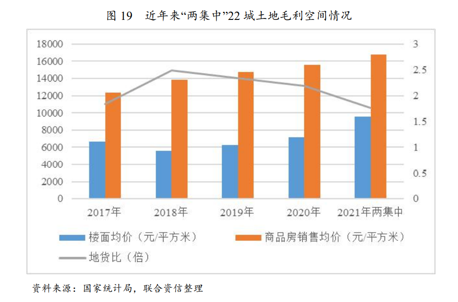 2018年起,22城地貨比(商品房銷(xiāo)售均價(jià)/樓面均價(jià))呈逐步下降態(tài)勢(shì),表現(xiàn)為土地毛利空間的持續(xù)壓縮,盡管當(dāng)期拿地與當(dāng)期銷(xiāo)售價(jià)格并非完全對(duì)應(yīng),但從占比的變化趨勢(shì)來(lái)看,2021年“兩集中”首批供地新增拿地項(xiàng)目的平均盈利水平處于近年來(lái)新低。一方面,穩(wěn)定的去化能力、可觀的流量貢獻(xiàn)以及居前的購(gòu)買(mǎi)力水平等安全邊際效應(yīng)疊加補(bǔ)庫(kù)存及恐慌性搶購(gòu)?fù)苿?dòng)核心城市土地市場(chǎng)的高燒不退,土地價(jià)格大幅增長(zhǎng);另一方面,熱門(mén)地塊“限房?jī)r(jià)”規(guī)則直接鎖死項(xiàng)目利潤(rùn)上限,倒逼房企通過(guò)自身產(chǎn)品力及管理紅利創(chuàng)造有限的利潤(rùn)空間。此外,配建率的提升進(jìn)一步壓縮項(xiàng)目可售規(guī)模,推高實(shí)際成本,侵蝕房企利潤(rùn),競(jìng)爭(zhēng)愈激烈的城市侵蝕效果愈明顯。