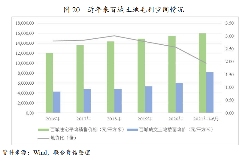 橫向?qū)Ρ葋?lái)看,近年來(lái),百城土地毛利空間整體較22城高出近20%,但隨著時(shí)間推移,差距逐步縮小。百城地貨比近年變動(dòng)趨勢(shì)與22城相仿,2021年上半年,土地市場(chǎng)價(jià)格顯著走高,地貨比降至近年低點(diǎn)。2021年上半年,隨著22城及其他自發(fā)采取“雙集中”政策的熱點(diǎn)城市進(jìn)入集中供地階段,全國(guó)土拍核心城市土地供應(yīng)階段性斷檔,導(dǎo)致中小城市的外溢性拿地需求提升,進(jìn)而推升整體土地市場(chǎng)價(jià)格。同時(shí),在當(dāng)前房住不炒的背景環(huán)境下,若仍舊執(zhí)行嚴(yán)格的限價(jià)措施,上半年新增拿地項(xiàng)目的整體盈利能力將十分有限。