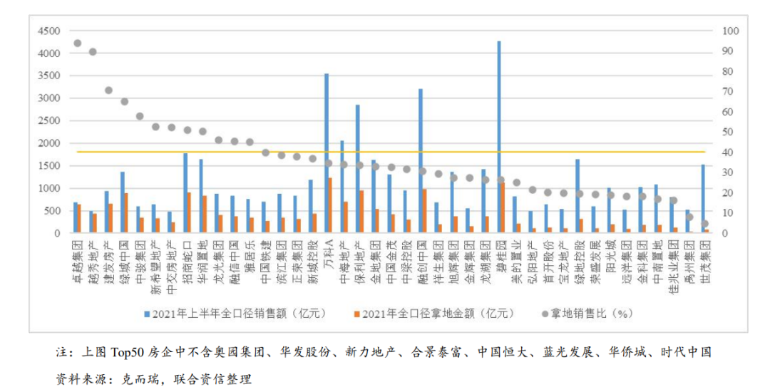 上半年Top50房企拿地力度分化嚴(yán)重,9家房企拿地銷(xiāo)售比超過(guò)50%,3家過(guò)70%,在土地毛利空間新低的背景下,需關(guān)注房企拿地節(jié)奏過(guò)快帶來(lái)的盈利及流動(dòng)性風(fēng)險(xiǎn);10家房企拿地銷(xiāo)售比低于20%,2家低于10%。房企拿地變動(dòng)受資金面狀況、去杠桿壓力、補(bǔ)庫(kù)存需求、利潤(rùn)空間研判、發(fā)展規(guī)劃調(diào)整等多種因素影響,房企積極拿地,間接說(shuō)明近期資金面相對(duì)寬松,補(bǔ)庫(kù)存需求迫切,反之可能表明房企受制于金融監(jiān)管約束或資金端承壓。此外,在拿地銷(xiāo)售比限制下,上半年拿地較多的房企后續(xù)拍地空間比較有限,新增土儲(chǔ)趨于審慎。
