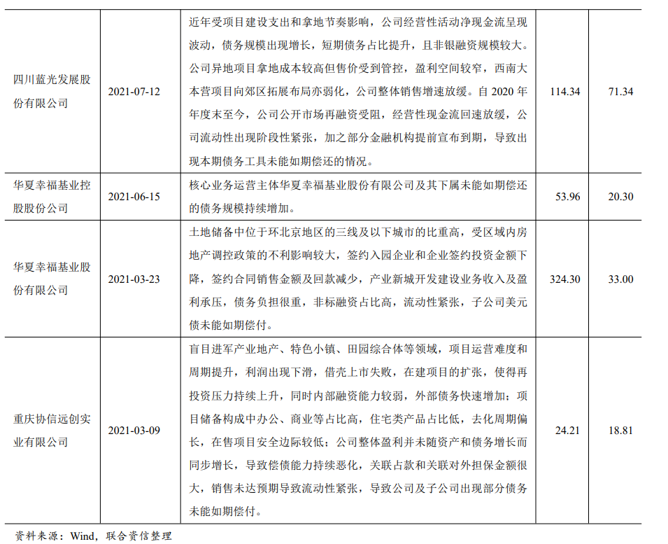 2021年以來(lái),房企債券市場(chǎng)新增實(shí)質(zhì)性違約企業(yè)包括四川藍(lán)光發(fā)展股份有限公司(以下簡(jiǎn)稱(chēng)“藍(lán)光發(fā)展”)、華夏幸福基業(yè)控股股份公司、華夏幸福基業(yè)股份有限公司和重慶協(xié)信遠(yuǎn)創(chuàng)實(shí)業(yè)有限公司(以下簡(jiǎn)稱(chēng)“協(xié)信遠(yuǎn)創(chuàng)”),均主要體現(xiàn)出了前期投資擴(kuò)張激進(jìn),項(xiàng)目銷(xiāo)售不及預(yù)期,項(xiàng)目回款明顯減少,非標(biāo)融資占比高,債務(wù)負(fù)擔(dān)重等特征,具體明細(xì)如下。