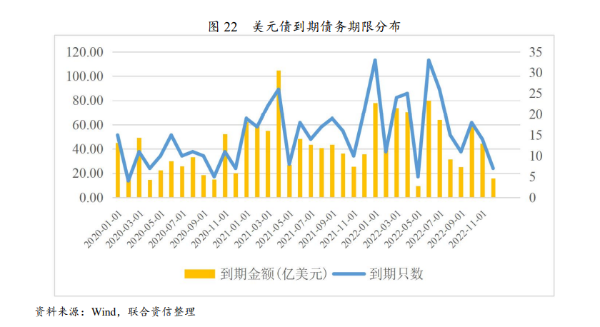 從房企到期債務(wù)期限分布來(lái)看,2021年1月及3月房企已經(jīng)歷一波償債高峰,進(jìn)入2021年下半年,9月隨著部分進(jìn)入回售期的債券數(shù)量的增加,房企到期債務(wù)量將呈現(xiàn)一波小高峰,隨后償債壓力將有所回落,但2022年房企到期債務(wù)壓力仍較大。美元債方面,2021年后半年到期債務(wù)數(shù)量及金額較上年有所下降,但進(jìn)入2022年尤其是2022年上半年,美元債到期數(shù)量及金額將顯著增加,未來(lái)房企仍面臨較大的兌付壓力,需持續(xù)關(guān)注房企流動(dòng)性風(fēng)險(xiǎn)及債務(wù)接續(xù)安排。