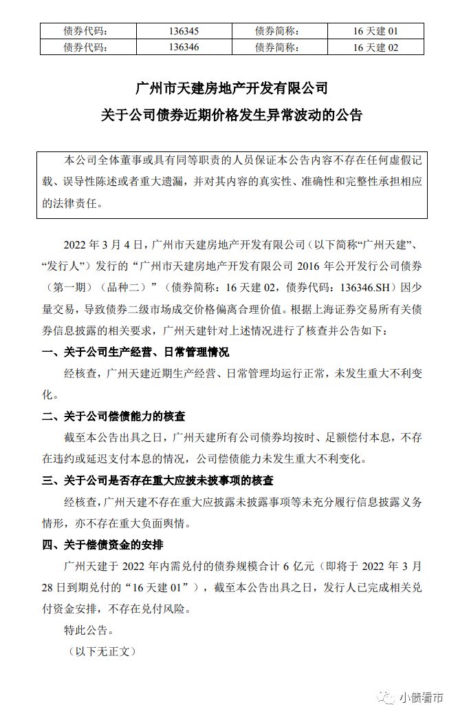 3月9日,廣州市天建房地產開發(fā)有限公司(以下簡稱“廣州天建”)公告稱,3月4日公司發(fā)行的“16天建02”因少量交易,導致債券二級市場成交價格偏離合理價值。