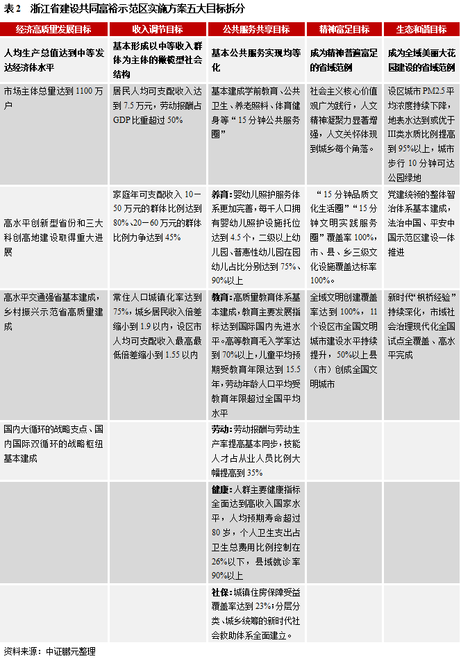 浙江省建設(shè)共同富裕示范區(qū)包含經(jīng)濟(jì)、收入、公共服務(wù)等五個(gè)目標(biāo)。細(xì)化來(lái)看,目標(biāo)包含GDP總量、可支配收入、中等收入占比、公共文化服務(wù)圈、社會(huì)保障等量化目標(biāo)。這一方案或?qū)⒊蔀椤洞龠M(jìn)共同富裕行動(dòng)綱要》中的績(jī)效參考。