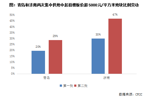 1) 溢價率上限明顯下調(diào):青島和濟(jì)南本次出讓所有涉宅地塊的最高溢價率均限制在15%以內(nèi),而首輪兩個城市均有地塊成交溢價率超過60%。