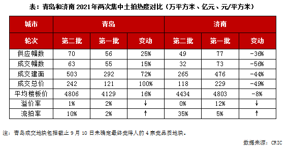 繼福州之后,青島和濟(jì)南也在9月上旬迎來了第二次集中土拍。和此前完成二輪土拍的福州多宗地觸頂搖號不同的是,青島和濟(jì)南二輪集中成交熱度則稍顯平淡,多宗土地在開拍前臨時撤牌,成交地塊均是零溢價成交。和首輪相比,青島和濟(jì)南二輪土拍發(fā)生了哪些變化?對市場后期走勢會有怎樣的變化?