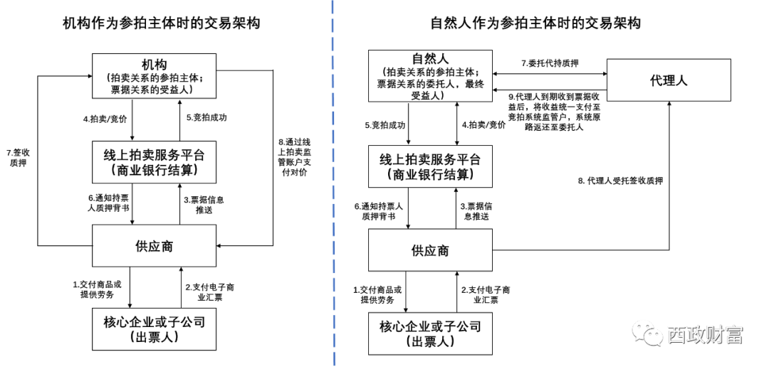 在競(jìng)拍時(shí),若競(jìng)拍人是自然人的,其資金流向如下:自然人將競(jìng)拍資金打入拍賣平臺(tái)在商業(yè)銀行開立的資金專用賬戶——商業(yè)銀行主動(dòng)匹配入賬資金并劃轉(zhuǎn)至該自然人在商業(yè)銀行以自身名義開立的電子賬戶——競(jìng)得后,競(jìng)拍資金由商業(yè)銀行劃轉(zhuǎn)至供應(yīng)商在商業(yè)銀行開立的電子賬戶——供應(yīng)商提款。在提示付款后,資金流向如下:到期時(shí)受托代理機(jī)構(gòu)提示付款——資金到代理機(jī)構(gòu)在銀行開設(shè)的接受質(zhì)權(quán)質(zhì)押票據(jù)專戶——資金劃入拍賣平臺(tái)在商業(yè)銀行開立的資金專用賬戶——商業(yè)銀行主動(dòng)匹配入賬資金并劃轉(zhuǎn)至代理機(jī)構(gòu)在商業(yè)銀行以代理人名義開立的電子賬戶——支付至該自然人在商業(yè)銀行開設(shè)的電子賬戶。