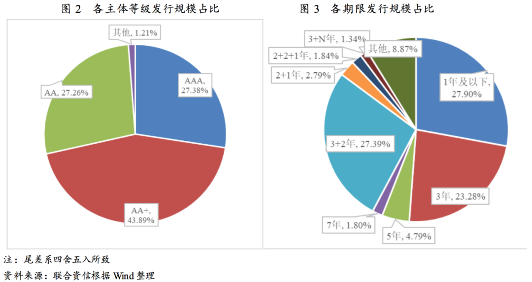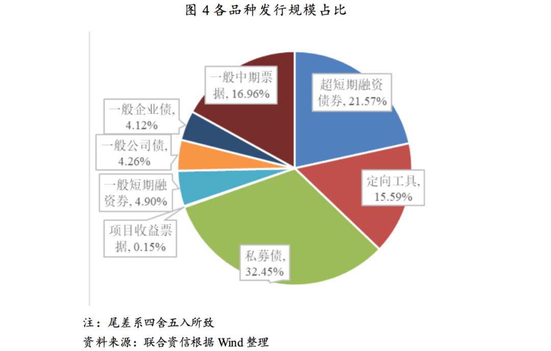 公、私募發(fā)行規(guī)模占比保持均衡態(tài)勢,公募占比略有上升;發(fā)行期限仍以中短期為主,3年期發(fā)行規(guī)模占比進一步上升;發(fā)行品種以私募公司債和超短期融資券為主,一般中期票據(jù)和定向工具發(fā)行規(guī)模快速增長。