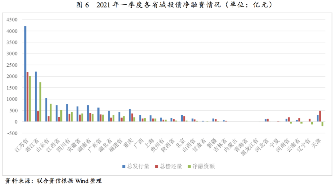 2021年一季度,再融資需求擴大及市場情緒修復,城投債發(fā)行規(guī)模大幅增長,但凈融資仍呈區(qū)域分化態(tài)勢;貨幣政策邊際收緊導致發(fā)行利率同比上升明顯。二季度,市場資金面邊際收緊態(tài)勢仍將延續(xù),城投債到期規(guī)模仍較大,但考慮一季度城投債凈融資及二季度地方政府債發(fā)行加速等因素,二季度城投債發(fā)行增速將放緩。貨幣政策邊際收緊及地方政府隱性債務高壓監(jiān)管的態(tài)勢下,城投債信用風險持續(xù)分化。對于政府債務負擔重、經(jīng)濟下行壓力大、非標信用風險事件頻發(fā)區(qū)域,尤其是信用資質(zhì)較弱、非標融資占比較高城投企業(yè)的信用風險仍需持續(xù)關注。