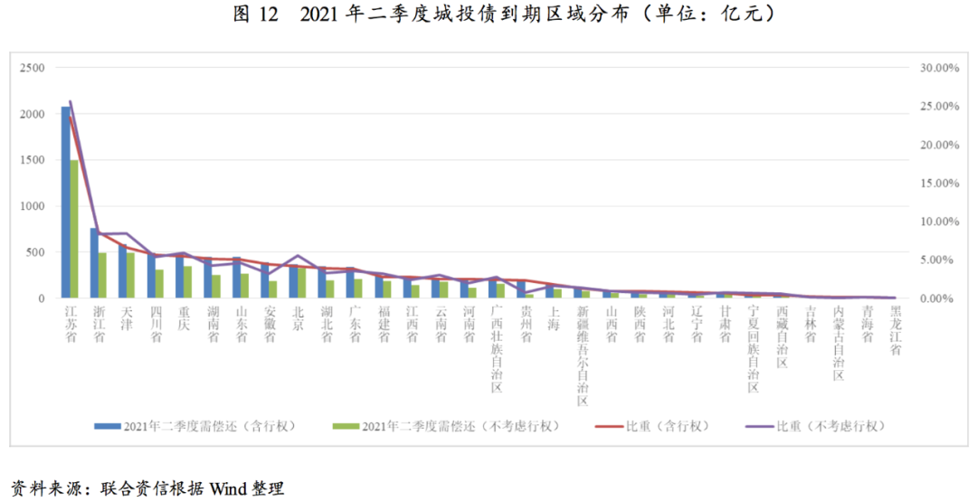 截至一季度末,有存續(xù)債券的城投企業(yè)共2812家,存續(xù)城投債券共15930支,存續(xù)債券余額120494.31億元。從地區(qū)分布看,江蘇省城投債券余額為24893.85億元,占比為20.66%,居于首位;浙江省、山東省、四川省和湖南省分列二至五名,占比分別為12.12%、7.01%、6.34%和6.30%。