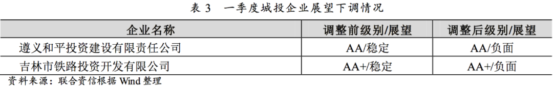 一季度,城投企業(yè)主體級別無調(diào)降的情況。評級展望由穩(wěn)定調(diào)整為負面的城投企業(yè)2家,貴州省和吉林省各1家,展望下調(diào)原因主要包括區(qū)域融資環(huán)境較差、企業(yè)自身流動性壓力較大、新增不良信貸記錄等。