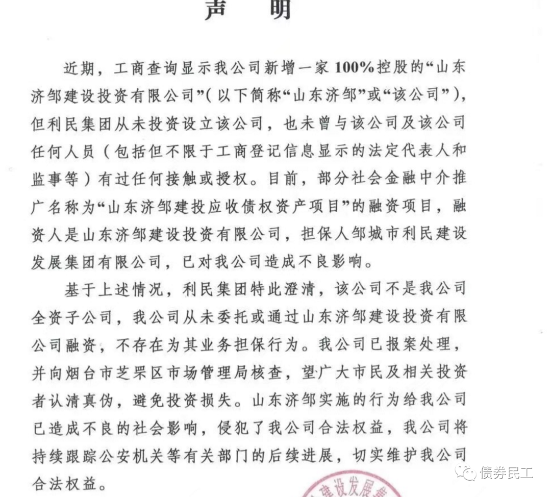 2021年12月10日,鄒城市利民建設(shè)發(fā)展集團(tuán)有限公司(以下簡(jiǎn)稱“鄒城建發(fā)”)發(fā)布聲明,工商查詢顯示新增一家100%控股的“山東濟(jì)鄒建設(shè)投資有限公司”,該公司不是公司的全資子公司。鄒城建發(fā)從未委托或通過山東濟(jì)鄒建設(shè)投資有限公司融資,不存在為其業(yè)務(wù)擔(dān)保行為。