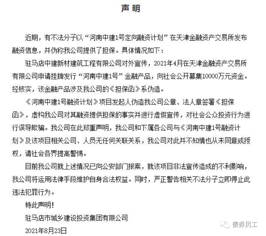 2、2021年8月23日,駐馬店市城鄉(xiāng)建設(shè)投資集團(tuán)有限公司發(fā)布聲明表示,有不法分子以“河南中建1號(hào)定向融資計(jì)劃”在天津金融資產(chǎn)交易所發(fā)布定融產(chǎn)品信息,偽造了公司的擔(dān)保函。