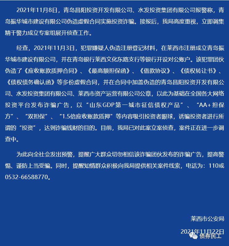 1、2021年11月22日,某李鬼城投公司(青島振華城市建設(shè)有限公司)假冒“水發(fā)投資集團(tuán)有限公司”和“萊西市資產(chǎn)運(yùn)營有限公司”的名義在某平臺(tái)發(fā)行定融產(chǎn)品“青島萊西振華城建2021應(yīng)收債權(quán)”,直接被公安機(jī)關(guān)認(rèn)定為詐騙并發(fā)布預(yù)警。從李鬼城投公司的公司名稱可以看出,相關(guān)不法分子深諳城投公司的特點(diǎn),明顯是在公司名稱上碰瓷城投公司,同時(shí)利用虛假的合同材料,企圖以城投公司的信用發(fā)行產(chǎn)品。