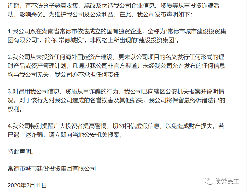 而且在融資之外的其他領(lǐng)域,也有不法分子利用城投公司的名義從事詐騙活動(dòng)。常德市城市建設(shè)投資集團(tuán)有限公司于2020年2月20日發(fā)布聲明稱,不法分子利用公司信息和資質(zhì)從事投資詐騙活動(dòng)。