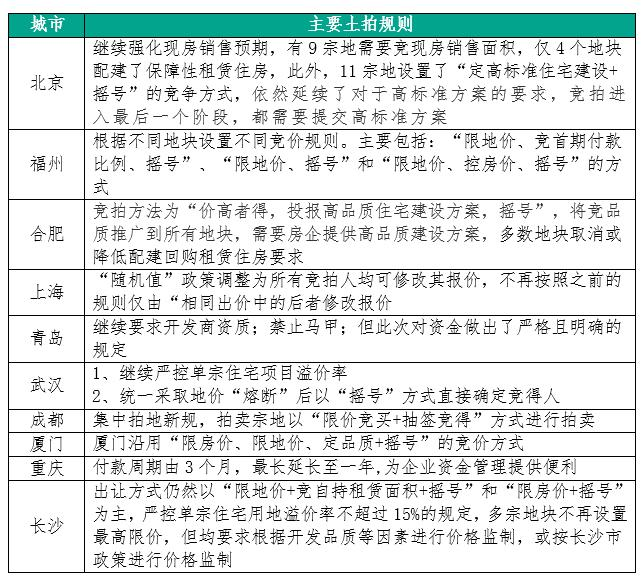 (1)集中出讓次數(shù)增加,供地量縮價(jià)漲,優(yōu)質(zhì)地塊放量;(2)土拍規(guī)則優(yōu)化,“化繁為簡(jiǎn)”,降門(mén)檻、提利潤(rùn),搖號(hào)/抽簽基本成標(biāo)配,提升企業(yè)拿地意愿;(3)市場(chǎng)熱度分化明顯,合肥、廈門(mén)土拍熱度升溫,而部分庫(kù)存較大或市場(chǎng)處于調(diào)整期的城市土拍熱度仍保持低位;(4)拿地企業(yè)仍以國(guó)央企為主,部分城市穩(wěn)健型、深耕型民企拿地積極性仍在。