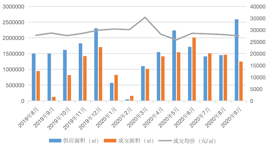 圖:2019年8月-2020年9月新建商品住宅月度供求量?jī)r(jià)