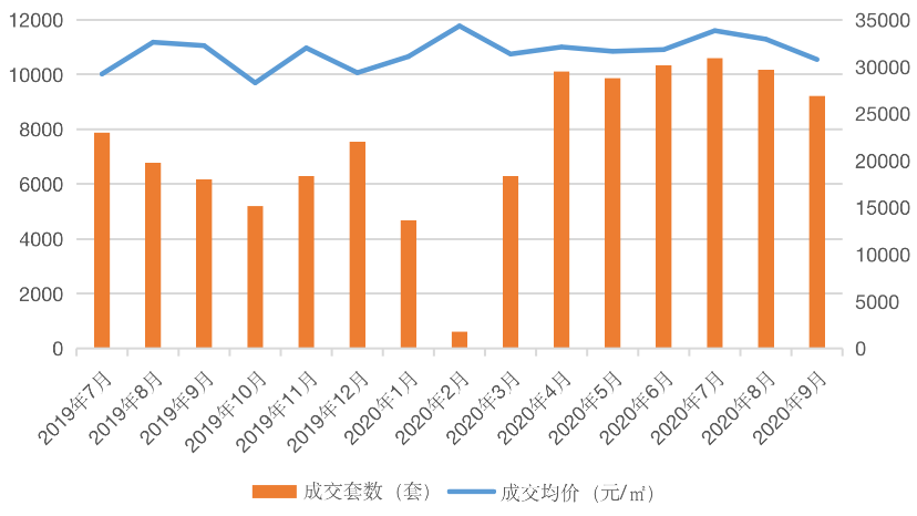 圖:2019年7月-2020年9月二手房成交量?jī)r(jià)月度走勢(shì)