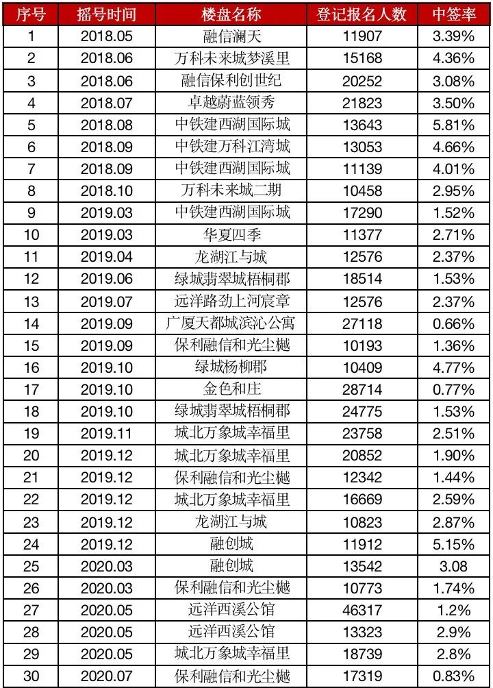 7月,杭州打響了三季度以來(lái)樓市調(diào)控第一槍。也是在這一個(gè)月,保利融信和光塵樾領(lǐng)到最后一張預(yù)售證,143套房子吸引了17319組客戶登記,中簽率只有0.83%。到目前為止,杭州仍未出現(xiàn)“萬(wàn)人搖”項(xiàng)目,截至目前,自2018年搖號(hào)政策實(shí)施以來(lái),杭州“萬(wàn)人搖”項(xiàng)目達(dá)到30次,其中今年共6次,三季度以來(lái)僅出現(xiàn)1次“萬(wàn)人搖”。