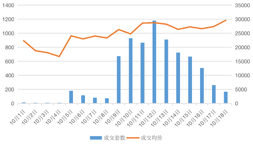 圖:2020年10月1-18日單日成交量?jī)r(jià)(單位:套、元/平方米)