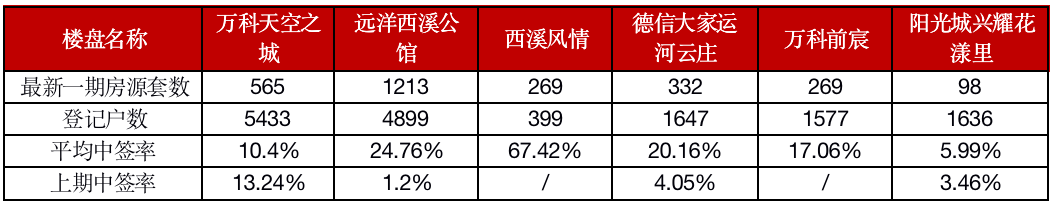 萬(wàn)科天空之城、德信大家運(yùn)河云莊、萬(wàn)科前宸、遠(yuǎn)洋西溪公館等6個(gè)紅盤項(xiàng)目加推,中簽率迅速走高。具體來(lái)看,6個(gè)項(xiàng)目中只有萬(wàn)科天空之城、陽(yáng)光城興耀花漾里兩個(gè)項(xiàng)目中簽率較低,但仍維持在10%左右,其余4個(gè)項(xiàng)目中簽率均在20%以上,最高的達(dá)到了67.42%。從登記戶數(shù)來(lái)看,基本在5000戶以下。