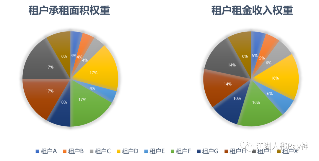 由于加權(quán)平均剩余租期衡量的是項目整體租賃收益的穩(wěn)定性,因此它所使用的權(quán)重,就必須是可用于評價租戶對整體收益影響程度的指標(biāo)。這方面的指標(biāo)通常來說同樣也就是面積和租金收入了——基于面積,是因為不同租戶的承租面積不同,對樓宇未來的出租情況影響程度不同;基于租金收入,是因為租戶承租單價存在差異,承租面積不能完全代表租戶對樓宇租賃收益的影響程度,租金收入才是更完整的體現(xiàn)。