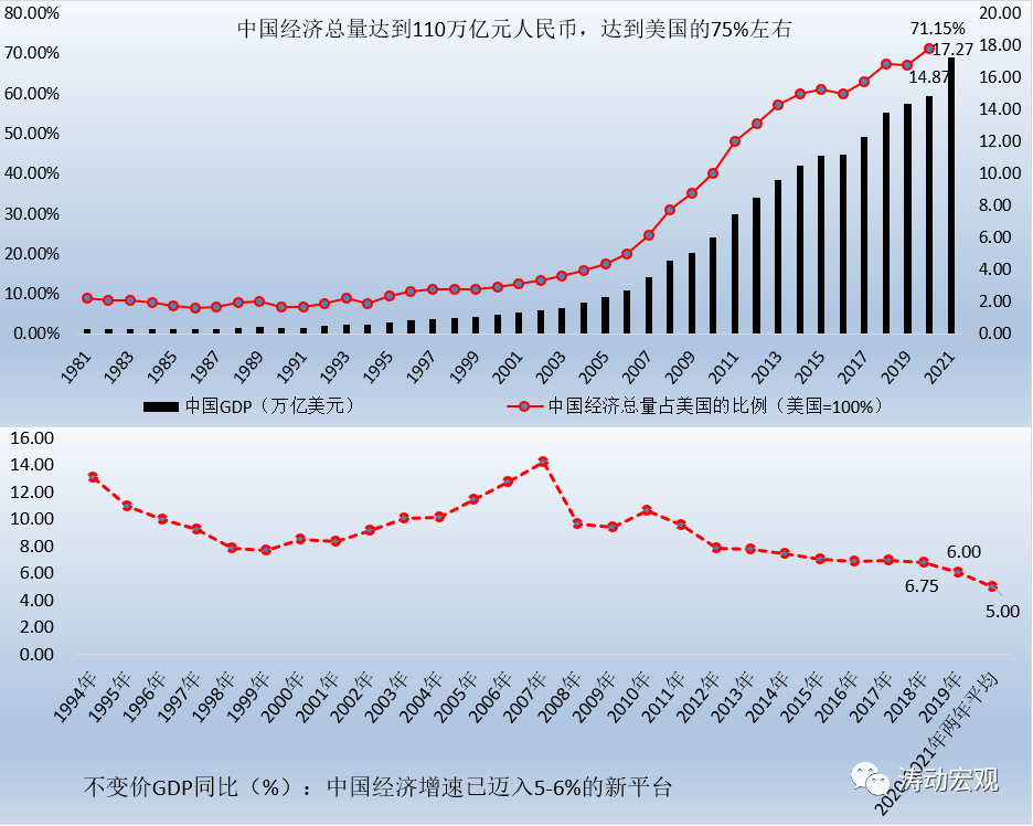 2021年12月11日,中財(cái)辦韓文秀副主任指出2021年中國經(jīng)濟(jì)總量將達(dá)到110萬億元人民幣(按照6.37的匯率測算約為17.27萬億美元),相當(dāng)于美國經(jīng)濟(jì)總量的75%左右,較2020年經(jīng)濟(jì)總量突破100萬億元人民幣又進(jìn)了一步。