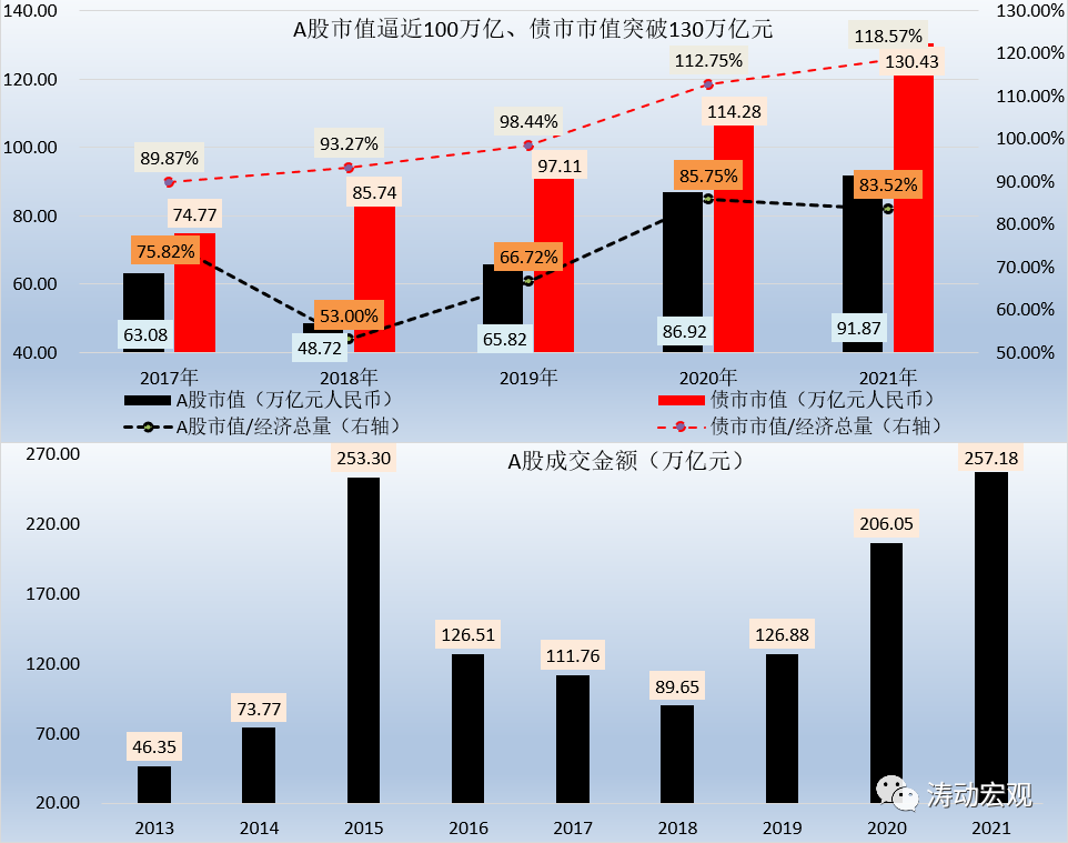股票市值和債市市值占經(jīng)濟(jì)總量的比例,往往代表著一體經(jīng)濟(jì)體的金融深化程度,數(shù)值上顯示,2021年A股市值和債市市值已分別達(dá)到91.87萬億和130萬億元左右,占經(jīng)濟(jì)總量的比例亦分別達(dá)到90%和120%左右。