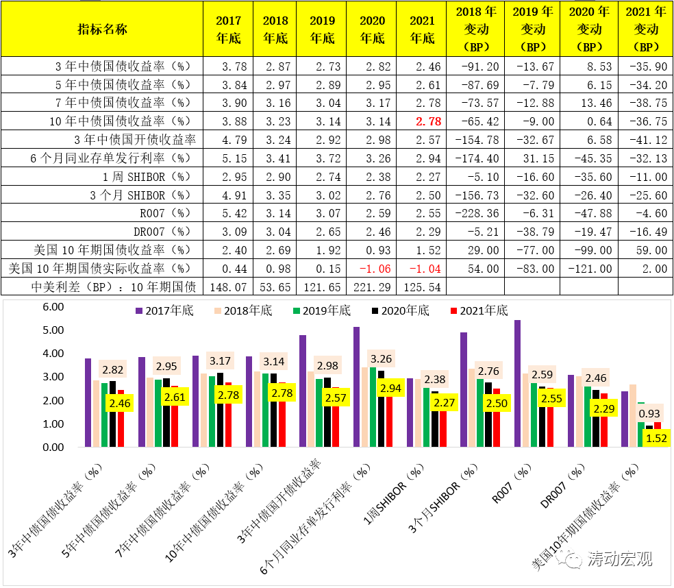 如果不考慮2020年的特殊年份,則中國債市自2018年起已連續(xù)牛了四年。以10年期中國國債收益率為例,2018年下行65.42BP、2019年下行9BP、2020年微幅上揚(yáng)0.64BP、2021年下行36.75BP,也即2018年以來已累計(jì)110BP,而10年期國債收益率亦已降至2.80%以下,中美利差相應(yīng)收窄至120-130BP之間。