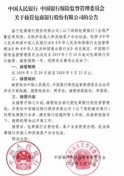 5月24日傍晚,中國人民銀行、中國銀行保險監(jiān)督管理委員會聯(lián)合發(fā)布公告,鑒于包商銀行股份有限公司出現(xiàn)嚴(yán)重信用風(fēng)險,中國銀行保險監(jiān)督管理委員會決定自2019年5月24日起對包商銀行實行接管,接管期限一年。