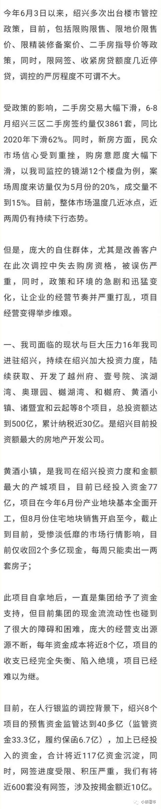信中稱,因限購(gòu)限售、房貸額度收緊等調(diào)控政策,融創(chuàng)中國(guó)(01918.HK)在浙江紹興的項(xiàng)目銷售慘淡,網(wǎng)簽進(jìn)度和按揭回款受限,公司懇請(qǐng)紹興市政府給予政策上的專項(xiàng)支持。