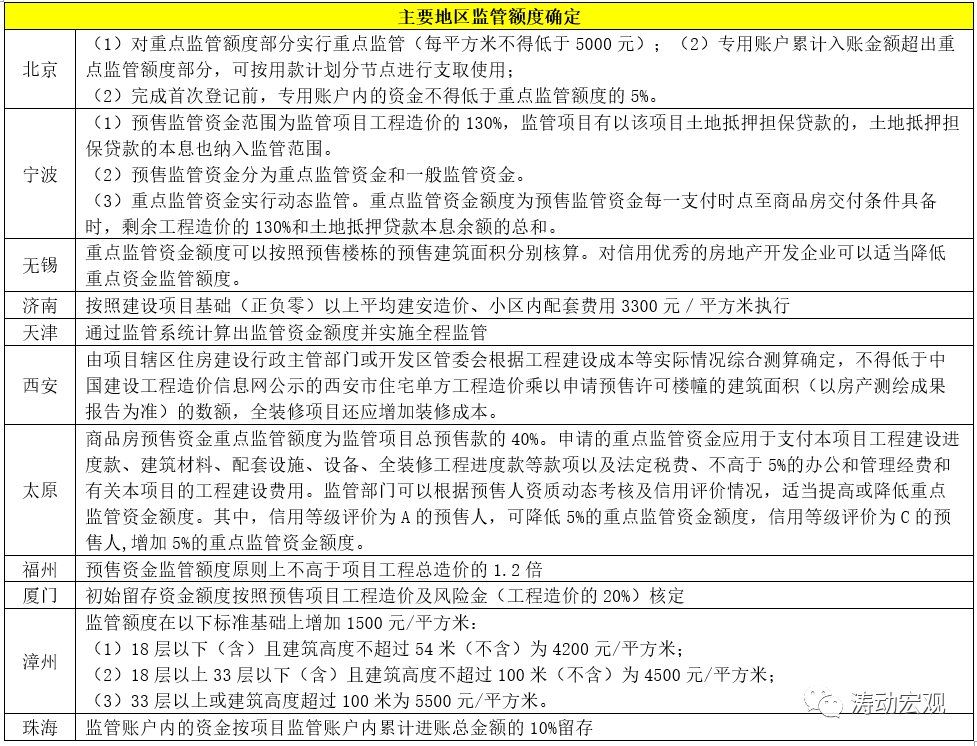 例如,北京、濟(jì)南、漳州等地區(qū)按照每平方米的建造成本來設(shè)定,寧波、福州、廈門等地區(qū)則按照工程造價(jià)款的一定倍數(shù)來設(shè)定(如寧波為1.30倍、福州和廈門為1.20倍等),太原則按照監(jiān)管項(xiàng)目總預(yù)售款的40%來設(shè)定等等。