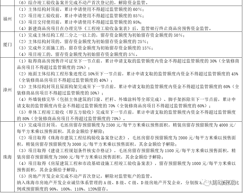 3、預(yù)售資金監(jiān)管的期限一般自核發(fā)商品房銷售許可證開始,至辦理不動(dòng)產(chǎn)首次登記后止。同時(shí),在預(yù)售監(jiān)管資金的使用上,一般會(huì)按照工程進(jìn)度的節(jié)點(diǎn)差異化監(jiān)管,主要的工程節(jié)點(diǎn)有地上“正負(fù)零”、地上1/3、地上1/2、地上2/3、主體封頂、二次結(jié)構(gòu)完成以及取得《建設(shè)工程竣工驗(yàn)收?qǐng)?bào)告》、《建設(shè)工程外裝修核驗(yàn)記錄》、《建設(shè)工程竣工驗(yàn)收備案證》、完成不動(dòng)產(chǎn)首次登記等等。