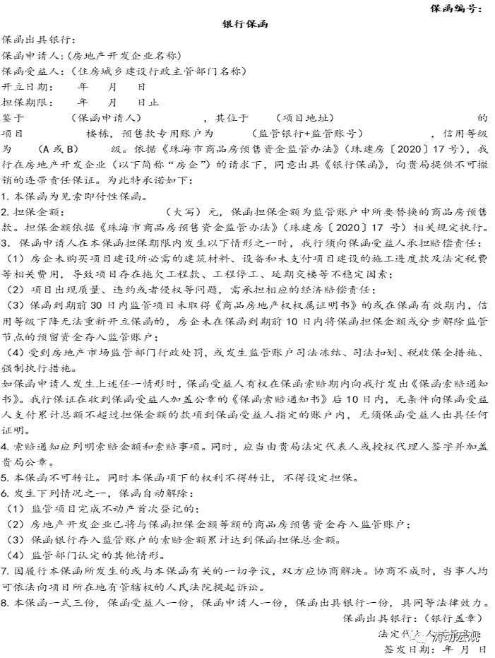 2、珠海在保函方面的規(guī)定比較詳細(xì)。具體看,珠海明確地產(chǎn)開發(fā)企業(yè)及其控股企業(yè)連續(xù)3個(gè)年度內(nèi)未受到住建部門行政處罰,且未發(fā)生監(jiān)管賬戶司法凍結(jié)、司法扣劃、稅收保全措施或強(qiáng)制執(zhí)行措施的,可憑銀行保函等額替換與其誠信等級(jí)相應(yīng)額度的商品房預(yù)售資金。商品房預(yù)售資金撥付時(shí),