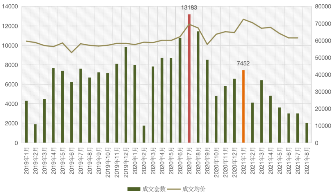 圖:2019年1月-2021年8月上海二手住宅成交量?jī)r(jià)走勢(shì)(單位:套,元/平方米)