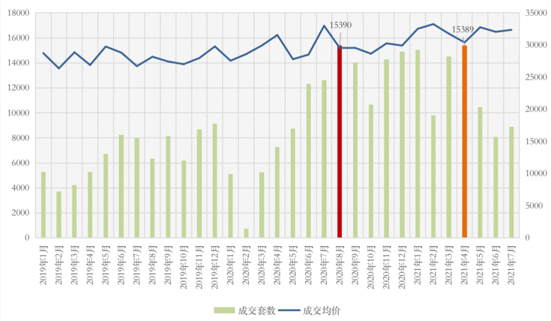 圖:2019年1月-2021年7月杭州二手住宅成交量?jī)r(jià)走勢(shì)(單位:套,元/平方米)