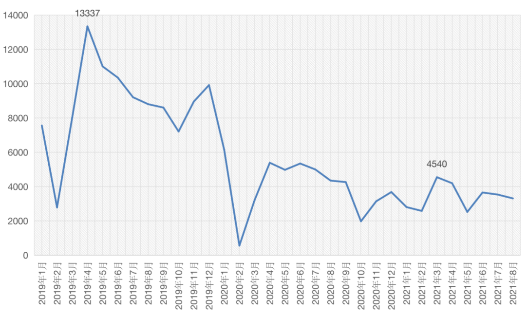 圖:2019年1月-2021年8月成都二手住宅成交套數(shù)走勢(shì)(單位:套)