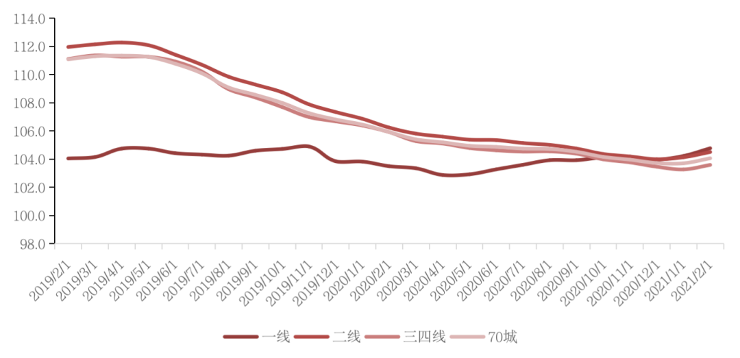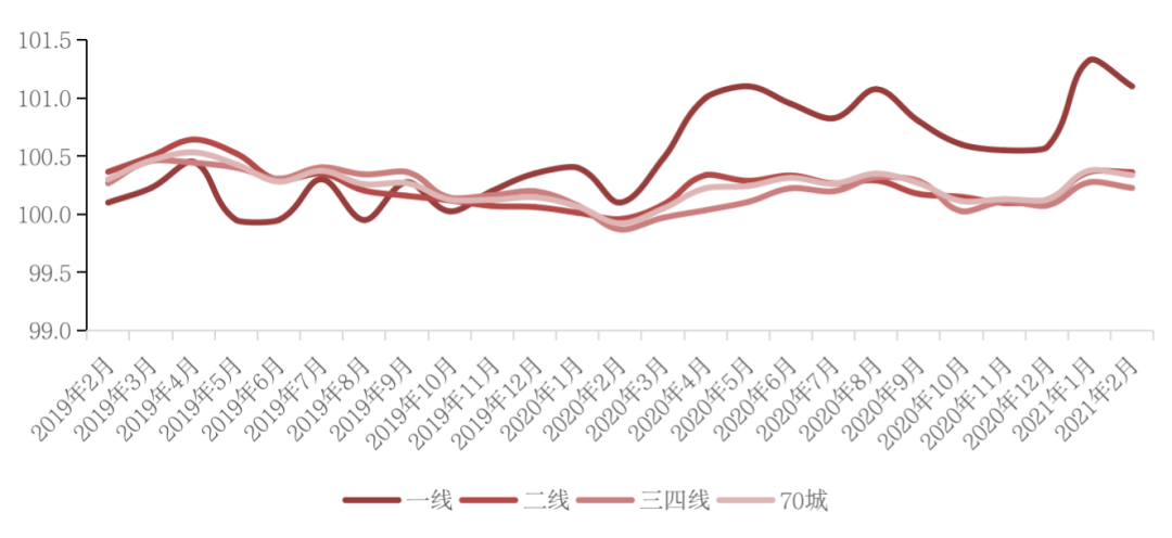 圖:2019年2月-2021年2月70城及各能級城市新建商品住宅價(jià)格指數(shù)環(huán)比走勢