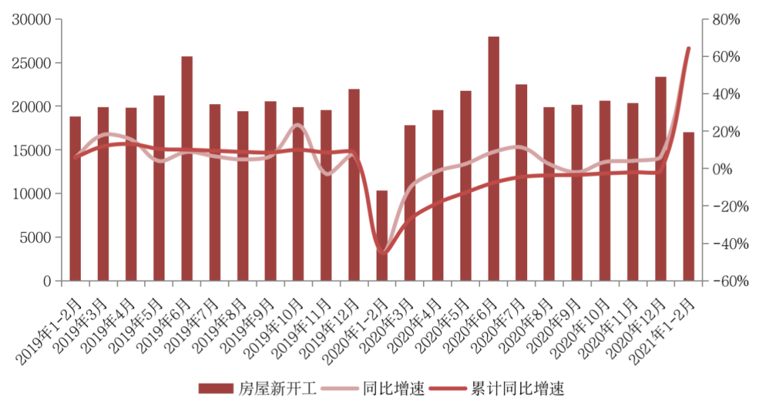 國家統(tǒng)計(jì)局?jǐn)?shù)據(jù)顯示,2021年1-2月房屋新開工面積17037萬平方米,同比增長64.3%,相較2019年同期下降9.4%。融資三道紅線約束下,房企融資依然承壓,多以搶施工、促回款為第一要?jiǎng)?wù),相較而言,新開工意愿不足。