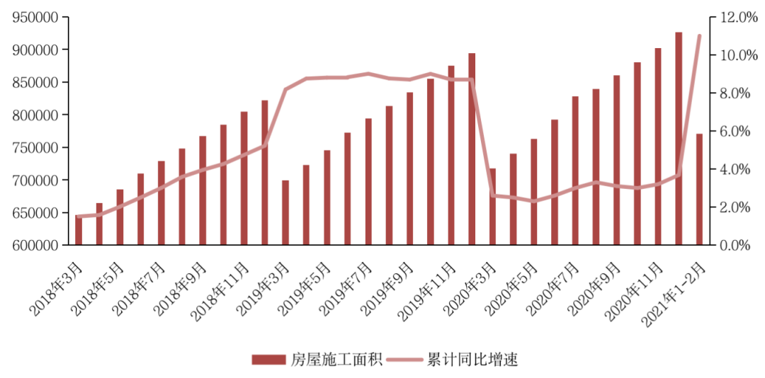 實(shí)際上,前2月房地產(chǎn)投資的主要支撐在于施工環(huán)節(jié)。1-2月,房地產(chǎn)開發(fā)企業(yè)房屋施工面積770629萬平方米,同比增長11.0%,相較2019年增長14.2%,房企加快施工進(jìn)度搶占春節(jié)等營銷節(jié)點(diǎn),支撐房地產(chǎn)開發(fā)投資保持較快增長。考慮到“三道紅線”影響,開發(fā)投資增速大幅上漲可能性不大,預(yù)計(jì)今年將呈平穩(wěn)上升走勢。