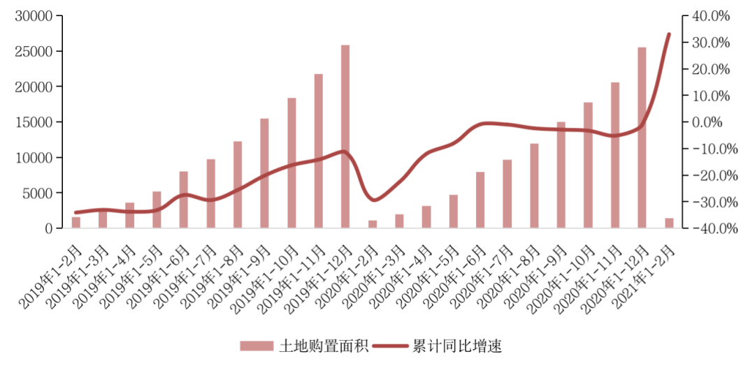 前2月,房地產(chǎn)開發(fā)投資同比增長38%,較2019年同期增長14%,并創(chuàng)下歷史同期新高。與此同時(shí),由于土地供應(yīng)明顯縮量,新開工面積和土地購置面積皆不及2019年同期。