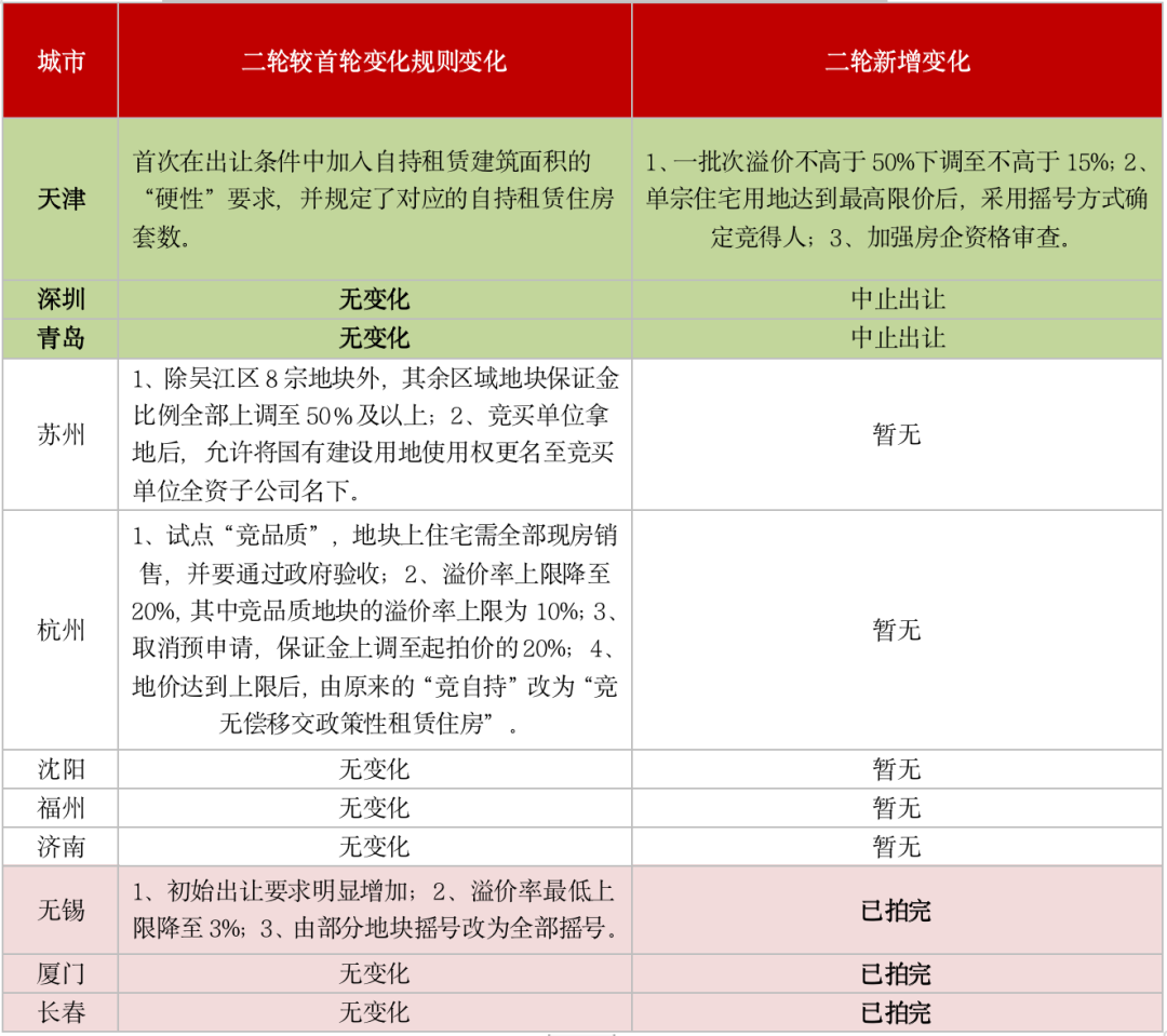 表:已發布二輪集中供地公告城市二輪供地規則變化及新增變化