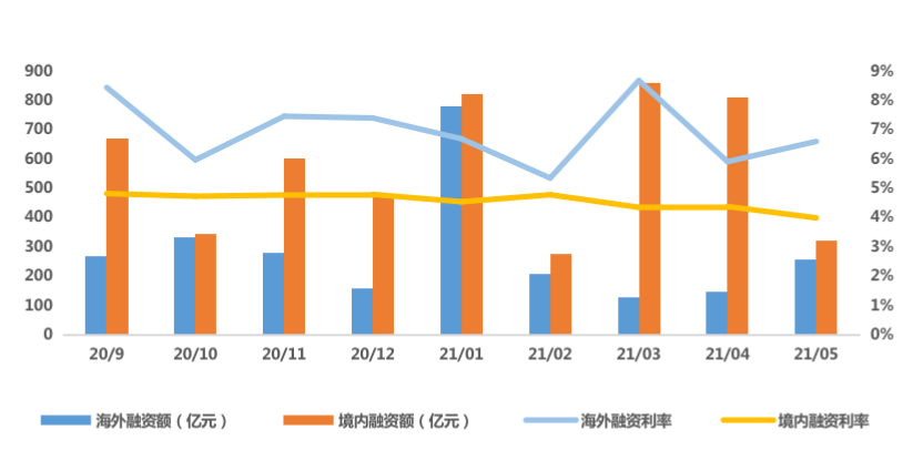 主要是由于境內融資收緊,5月出臺多項資產證券化產品的規范性政策限制房企融資,境內債權融資有所影響,融資量下降;受此影響,房企將關注點轉向海外,并且隨著近期人民幣走強等因素下,境外債權融資得到較大的恢復,5月出現同環比大增的勢頭。