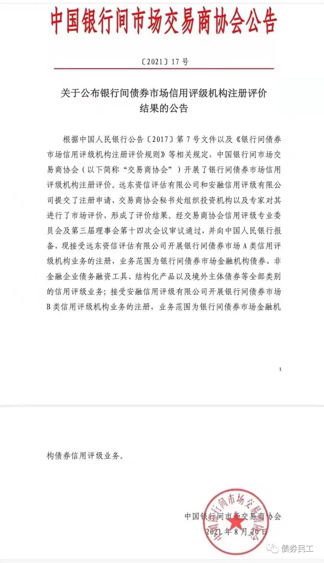 根據(jù)銀行間市場(chǎng)交易商協(xié)會(huì)2021年8月20日披露的《關(guān)于公布銀行間債券市場(chǎng)信用評(píng)級(jí)機(jī)構(gòu)注冊(cè)評(píng)價(jià)結(jié)果的公告》,遠(yuǎn)東資信評(píng)估有限公司被評(píng)定為A類信用評(píng)級(jí)機(jī)構(gòu),可以從事金融債券、非金融企業(yè)債務(wù)融資工具、結(jié)構(gòu)化產(chǎn)品和境外主體債券的評(píng)級(jí);安融信用評(píng)級(jí)有限公司被評(píng)定為B類信用評(píng)級(jí)機(jī)構(gòu),可以從事金融債券的評(píng)級(jí)。