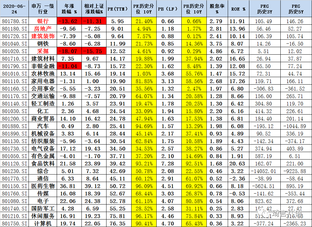 附一:申萬一級行業(yè) 漲跌幅、估值、股息率、ROE等數(shù)據(jù)