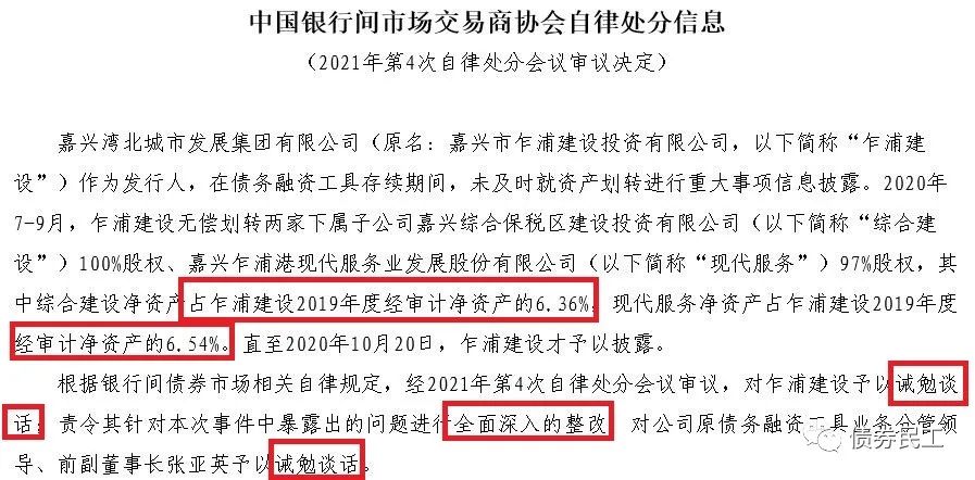 嘉興灣集團于2020年7-9月將兩家子公司(合計占2019年度凈資產超過10%)的股權無償劃轉,資產無償劃轉事宜披露不及時。交易商協(xié)會對嘉興灣集團處以誡勉談話、全面深入整改的自律處分。